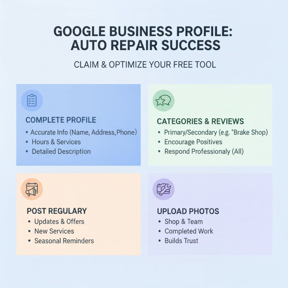 A Google Business Profile (GBP) is arguably the most critical free tool for local auto repair shops. An optimized and active profile appears in local search results and Google Maps, directly connecting with customers at the moment they need service. Here’s how to claim and optimize Google Business Profile: