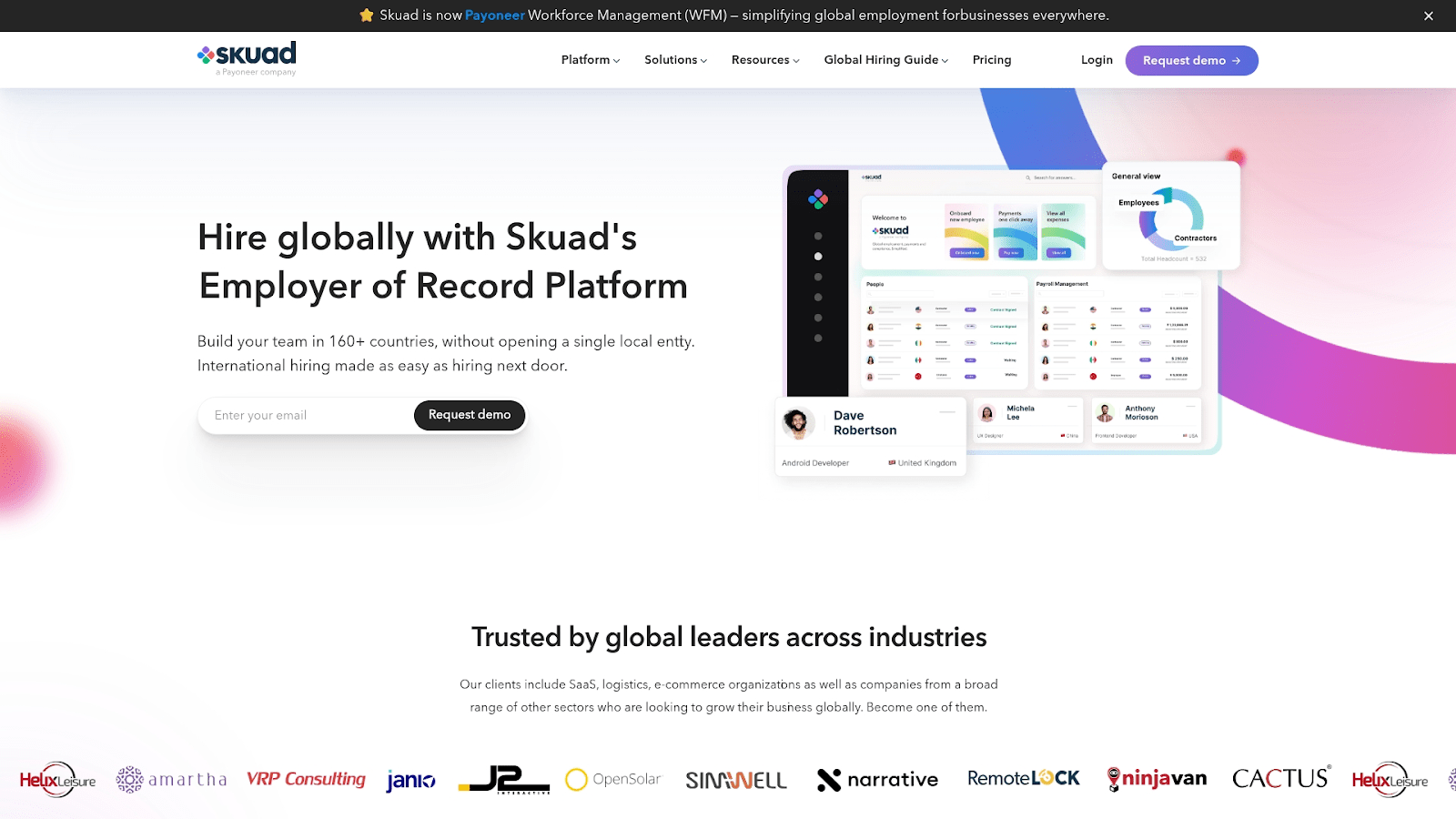 Skuad offers a comprehensive EOR solution with a focus on automated compliance and unified payroll management. The platform provides guided onboarding processes and benefits administration designed to simplify global hiring operations.