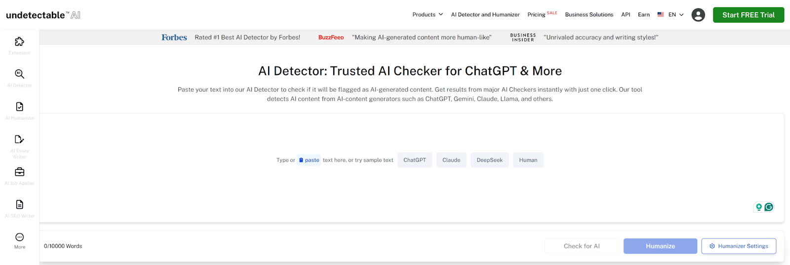 Undetectable AI combines text rewriting with built-in AI detection, making it appealing for users who want both tools in one place. It supports large inputs and offers detailed customization options, such as readability level and output preference. While its rewritten text doesn’t always feel fully human and may require manual cleanup, it performs reasonably well in detection tests. This tool is better suited for longer documents where detection checks matter as much as tone.