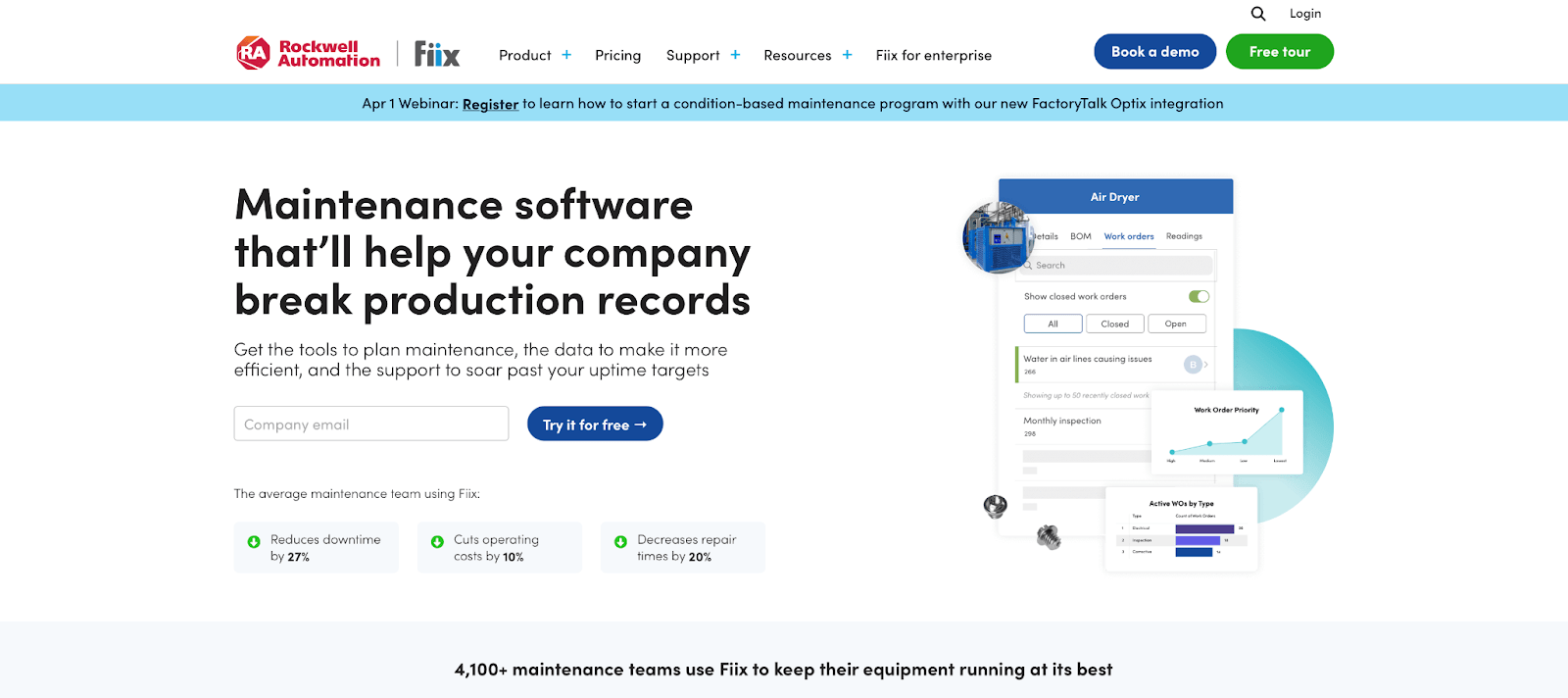 Fiix is a cloud-based CMMS platform owned by Rockwell Automation that provides asset management and predictive maintenance features for manufacturing organizations. Founded in 2016 and later acquired by Rockwell Automation, Fiix supports work order management, preventive maintenance scheduling, inventory control, and reporting across multi-site operations. The platform integrates with enterprise systems such as SAP and Oracle and includes AI-based anomaly flagging through its “Asset AI” module. It is positioned primarily as a CMMS with extended PdM capabilities rather than a standalone predictive maintenance system.